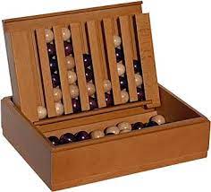placing balls into wooden runners (columns pretty much) on a box lid.